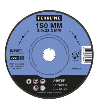 Диск отрезной по металлу FerrLine Expert 150 х 3 х 22,2 мм A46TBF - расходный инструмент для ручной угловой шлифовальной машины, предназначенный для резки различных изделий из чёрных металлов (чугунов). Конструктивно представляет собой плоский диск (тип 41), поверхность которого покрыта слоем абразивных частиц. Посыпка скреплена между собой бакелитовой связкой и армирована одной стекловолоконной сеткой и тканой подложкой. Поставляется во влагозащитной упаковке. Серия EXPERT - абразивный состав, оптимизированный для высокой износостойкости при резе чёрных металлов. Это свойство даёт увеличенный срок службы одного круга, давая возможность сделать значительно бОльшее количество резов заготовки, чем круги с обычным абразивом. Не рекомендуется для реза изделий из нержавеющей стали во избежание перегрева, прижога, окисления, потери эффективности легирующих добавок.