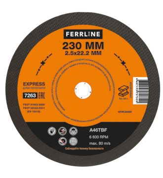 Диск отрезной по металлу FerrLine Express 230 х 2,5 х 22,2 мм A46TBF - расходный инструмент для ручной угловой шлифовальной машины, предназначенный для резки различных изделий из чёрных металлов (чугунов). Конструктивно представляет собой плоский диск (тип 41), поверхность которого покрыта слоем абразивных частиц. Посыпка скреплена между собой бакелитовой связкой и армирована одной стекловолоконной сеткой и тканой подложкой. Поставляется во влагозащитной упаковке. Серия EXPRESS представляет абразивный состав высокой твёрдости, оптимизированный для скоростного реза чёрных металлов. Не рекомендуется для реза изделий из нержавеющей стали во избежание перегрева, прижога, окисления, потери эффективности легирующих добавок.
