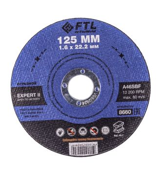 Диск отрезной по металлу FTL Expert II 125 х 1,6 х 22,2 мм A46SBF - расходный инструмент для ручной угловой шлифовальной машины, предназначенный для резки различных изделий из чёрных металлов (чугунов). Конструктивно представляет собой плоский диск (тип 41), поверхность которого покрыта слоем абразивных частиц. Посыпка скреплена между собой бакелитовой связкой и армирована одной стекловолоконной сеткой и тканой подложкой. Поставляется во влагозащитной упаковке. Серия EXPERT II — это эволюция абразивного компаунда общего назначения, оптимизированного для повышенной износостойкости. Новая формула состава предлагает ещё больше универсальности, позволяя работать также по изделиям из нержавеющей стали без искрообразования в случаях, если к качеству состава нержавеющей стали заготовки не предъявляются высокие требования. Максимальное количество резов достигается при работе с изделиями из чёрных металлов. *ВНИМАНИЕ! В случае повышенных требований к качеству нержавеющей стали заготовок не рекомендуется использовать во избежание перегрева, прижога, окисления, потери эффективности легирующих добавок - например, при резе элементов ответственных конструкций.