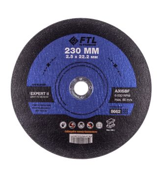 Диск отрезной по металлу FTL Expert II 230 х 2,5 х 22,2 мм A30SBF - расходный инструмент для ручной угловой шлифовальной машины, предназначенный для резки различных изделий из чёрных металлов (чугунов). Конструктивно представляет собой плоский диск (тип 41), поверхность которого покрыта слоем абразивных частиц. Посыпка скреплена между собой бакелитовой связкой и армирована одной стекловолоконной сеткой и тканой подложкой. Поставляется во влагозащитной упаковке. Серия EXPERT II — это эволюция абразивного компаунда общего назначения, оптимизированного для повышенной износостойкости. Новая формула состава предлагает ещё больше универсальности, позволяя работать также по изделиям из нержавеющей стали без искрообразования в случаях, если к качеству состава нержавеющей стали заготовки не предъявляются высокие требования. Максимальное количество резов достигается при работе с изделиями из чёрных металлов. *ВНИМАНИЕ! В случае повышенных требований к качеству нержавеющей стали заготовок не рекомендуется использовать во избежание перегрева, прижога, окисления, потери эффективности легирующих добавок - например, при резе элементов ответственных конструкций.