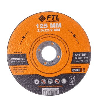Диск отрезной по металлу FTL Express 125 х 2,5 х 22,2 мм A46TBF - расходный инструмент для ручной угловой шлифовальной машины, предназначенный для резки различных изделий из чёрных металлов (чугунов). Конструктивно представляет собой плоский диск (тип 41), поверхность которого покрыта слоем абразивных частиц. Посыпка скреплена между собой бакелитовой связкой и армирована одной стекловолоконной сеткой и тканой подложкой. Поставляется во влагозащитной упаковке. Серия EXPRESS представляет абразивный состав высокой твёрдости, оптимизированный для скоростного реза чёрных металлов. Не рекомендуется для реза изделий из нержавеющей стали во избежание перегрева, прижога, окисления, потери эффективности легирующих добавок.