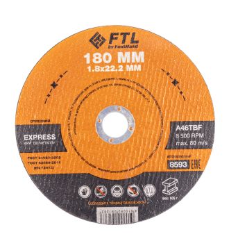 Диск отрезной по металлу FTL Express 180 х 1,8 х 22,2 мм A46TBF - расходный инструмент для ручной угловой шлифовальной машины, предназначенный для резки различных изделий из чёрных металлов (чугунов). Конструктивно представляет собой плоский диск (тип 41), поверхность которого покрыта слоем абразивных частиц. Посыпка скреплена между собой бакелитовой связкой и армирована одной стекловолоконной сеткой и тканой подложкой. Поставляется во влагозащитной упаковке. Серия EXPRESS представляет абразивный состав высокой твёрдости, оптимизированный для скоростного реза чёрных металлов. Не рекомендуется для реза изделий из нержавеющей стали во избежание перегрева, прижога, окисления, потери эффективности легирующих добавок.