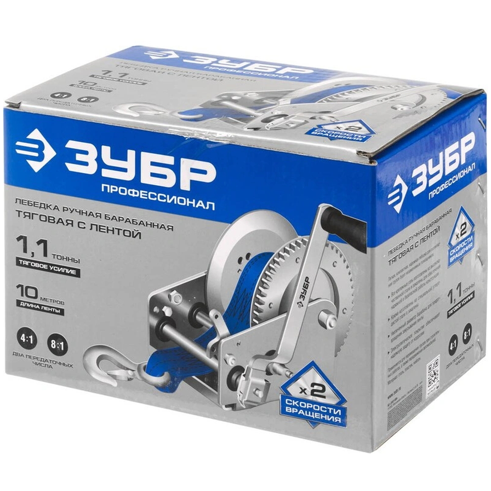 Технические характеристики лебёдки ручной барабанной ЗУБР тяговой ленточной 1,1т 10м