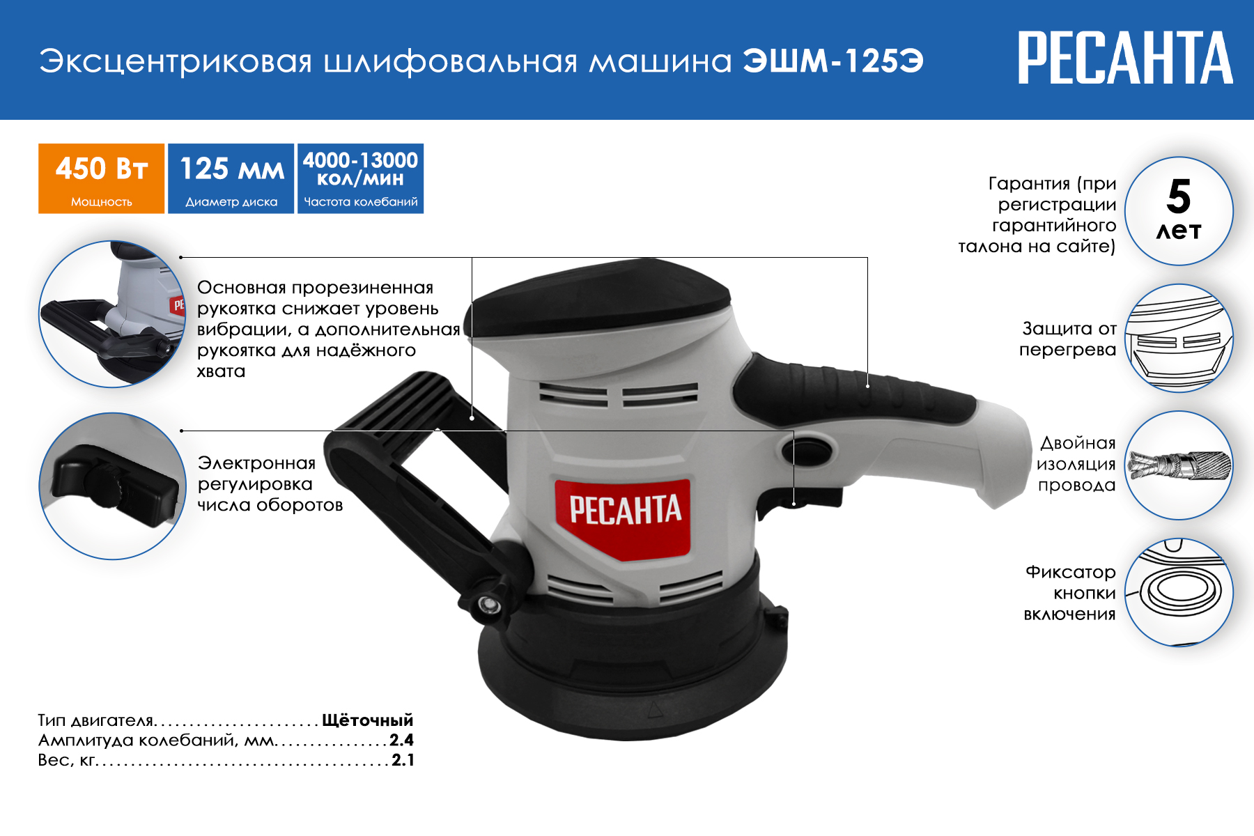 Машина эксцентриковая шлифовальная Ресанта ЭШМ-125Э 75/6/2 используется для качественного шлифования различных материалов с помощью абразивного (шлифовального) круга различной зернистости.