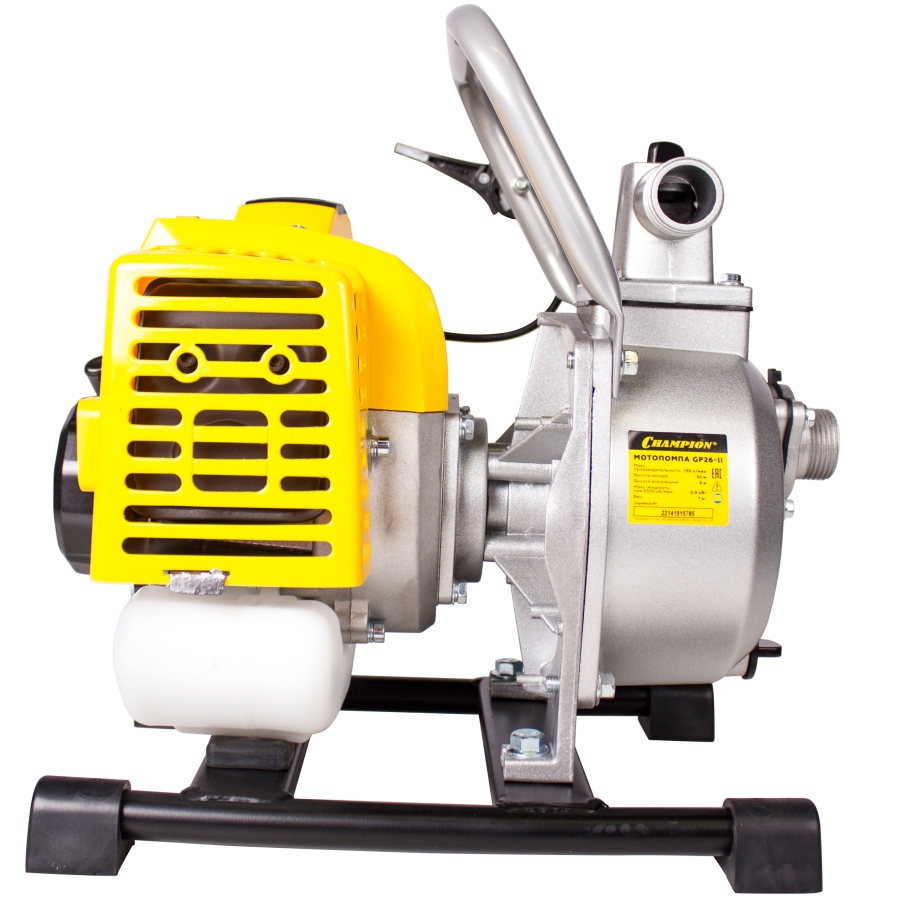- Металлическая рама с ножками гарантирует устойчивость мотопомпы CHAMPION GP26-II;
