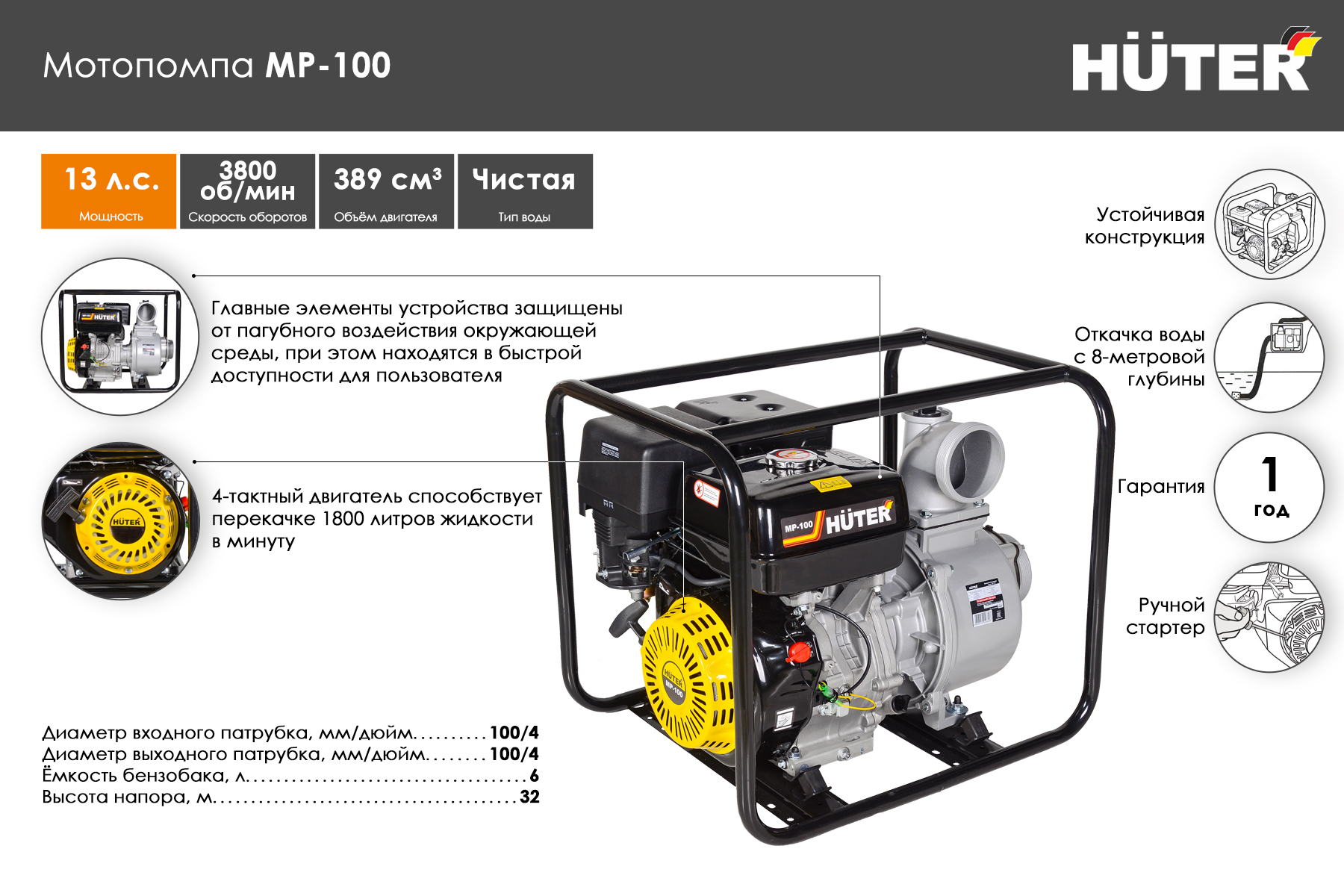 Мотопомпа MP-100 Huter используется для откачивания и подачи воды, орошения сельскохозяйственных участков, откачки воды из колодцев.