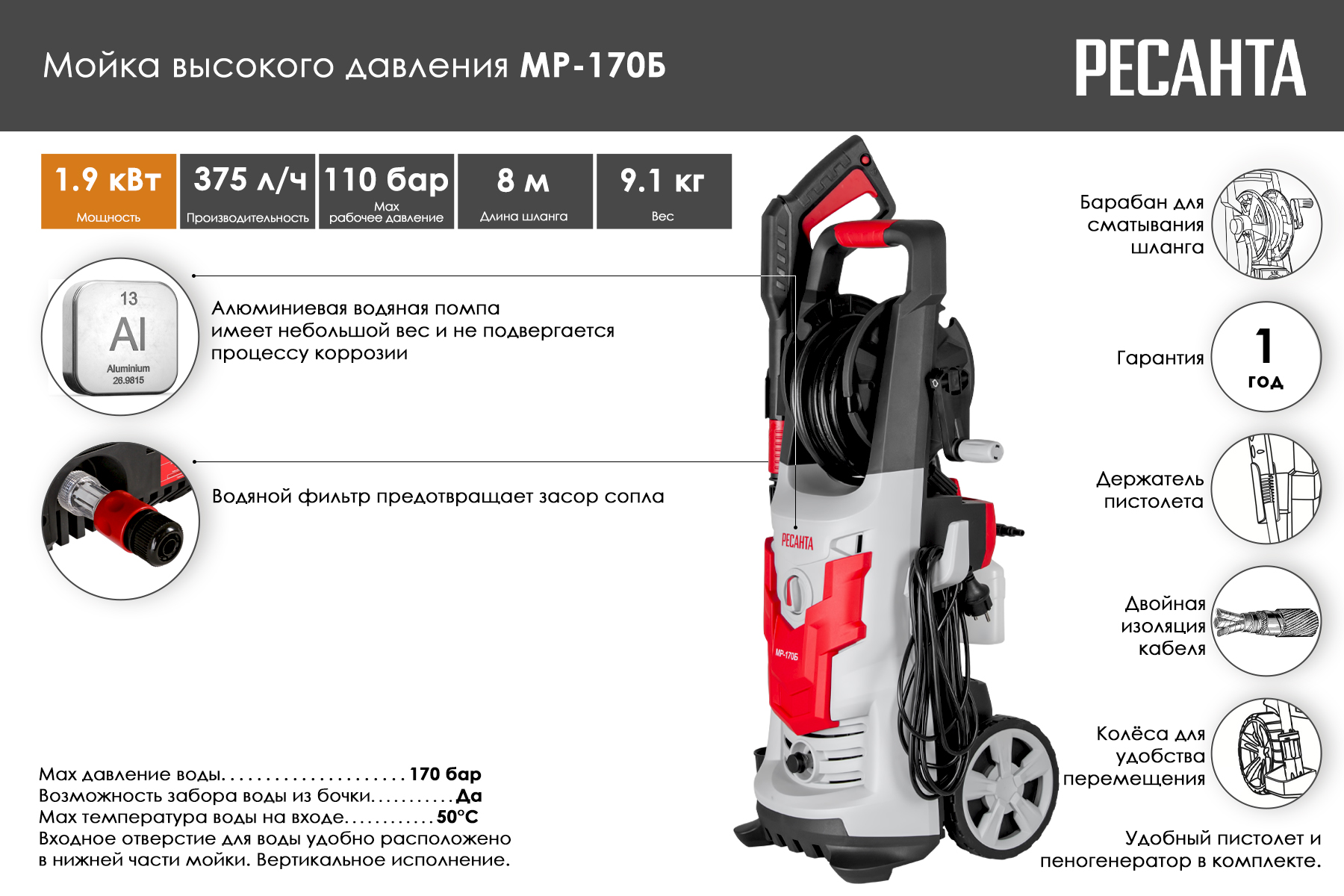 Мойка Ресанта МР-170Б 70/8/21 используется для очистки различной техники: машин, велосипедов, мотоциклов, садовых приспособлений и инвентаря. С ее помощью можно быстро убрать грязь с фасада здания, садовых дорожек, площадки перед домом.