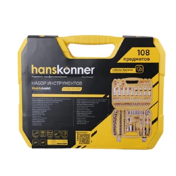 Набор инструментов Hanskonner 108 предметов используется для ремонта и обслуживания автомобилей и других транспортных средств. Является незаменимым помощником для работы в гараже, автомастерской или сервисном центре.