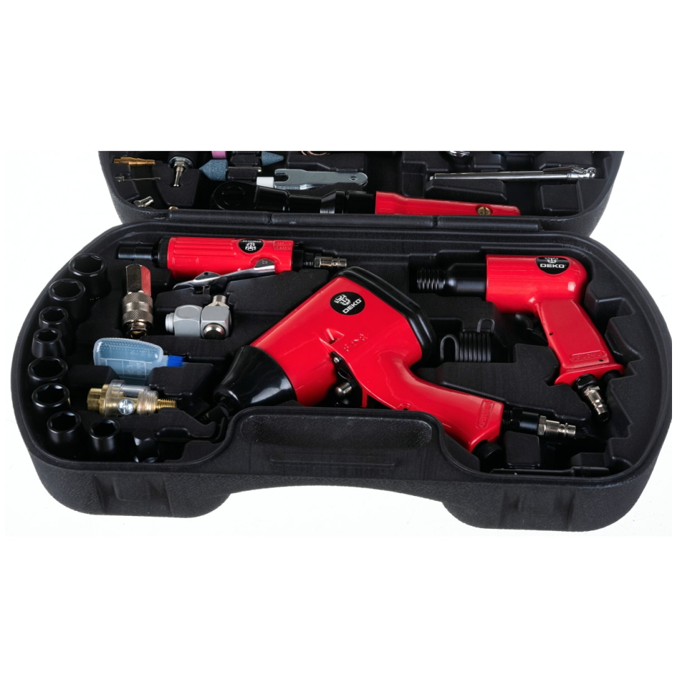 Набор пневмоинструмента и аксессуаров DEKO DKPT61 Premium 61 предмет используется в массовом производстве, автосервисах, шиномонтажных мастерских. Поставляется в прочном кейсе, который надежно защищает содержимое при транспортировке.