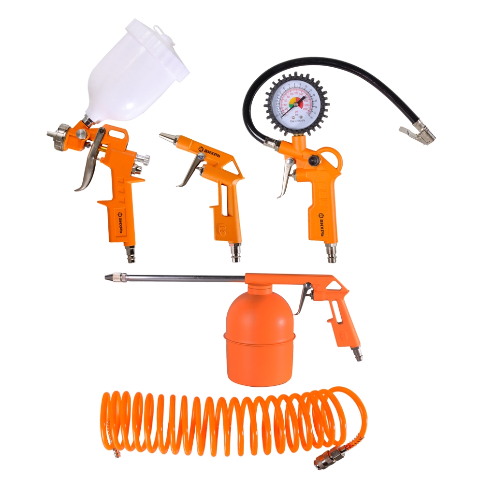 - В наборе краскопульт, пистолет для вязких жидкостей, пистолет для продувки, пистолет для накачки шин, шланг