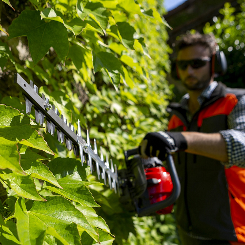 Длина ножа увеличена до 600 мм, что позволяет точно и быстро выравнивать большие площади кустарников. Инструмент хорошо сбалансирован в зоне хвата, а поворотная рукоятка позволяет удобно держать кусторез в любой плоскости. Силовой агрегат - бензиновый двухтактный двигатель выдает мощность 1 л/с (0.75 кВт), и этого достаточно для реза веток толщиной до 20 - 25 мм. Двигатель легко запускается благодаря функции «Easy On» (облегченный старт).