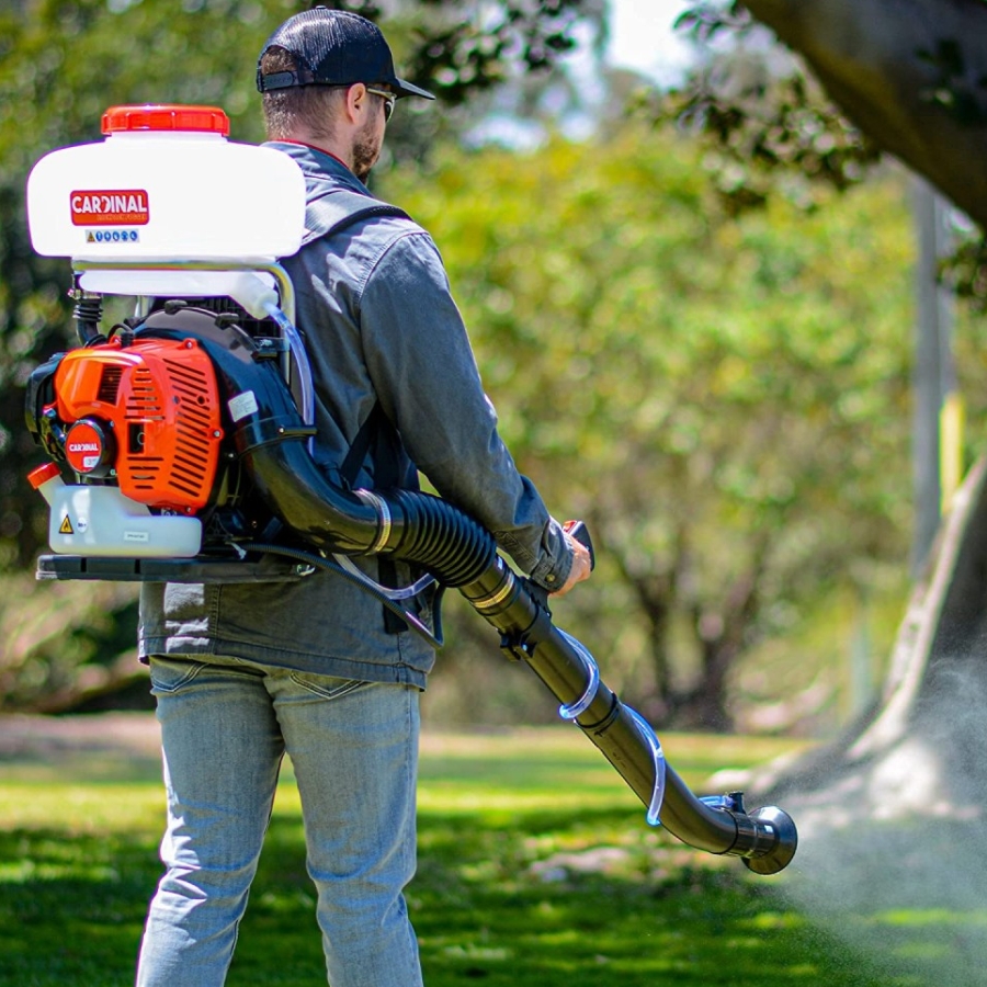 Опрыскиватель ZimAni SR900 состоит из двигателя с полупрозрачным бензобаком и компрессора, составного шланга для направления потока воздуха с реагентом, ёмкости для раствора, системы ранцевого типа.