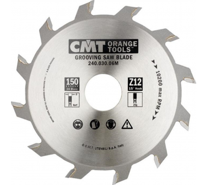 Пазовый пильный диск 150x30x2,0/1,4 15° FLAT Z=12 CMT - диск с усиленным полотном пилы для выпиливания пазов и канавок в мягкой и твёрдой древесине, МДФ, OSB и ДСП. Применение: выпиливания пазов и канавок. Оборудование: ручная циркулярная пила; аккумуляторная пила; торцовочная пила.