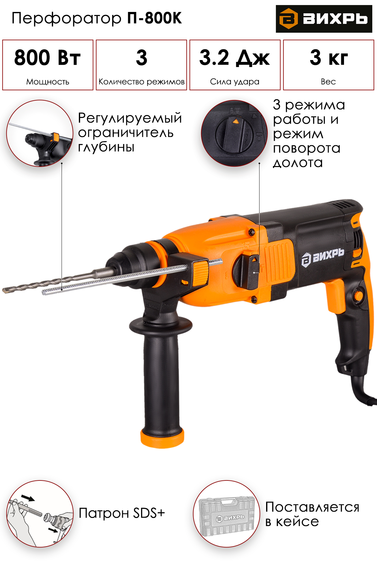 Перфоратор Вихрь П-800к используется для ударного сверления в кирпиче, бетоне и каменной породе, а также есть режим безударный для сверления древесины, металлов, керамики и синтетических материалов.