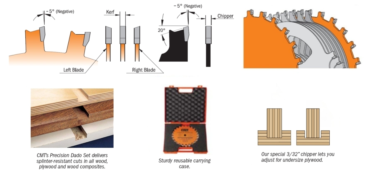 Пазовый пильный диск 230.520.06 СМТ Dado (дадо) – комплект дисков пазовых сегментов и дистанционных шайб. Диск устанавливается на вал настольной или стационарной пилы. Пила пазовая вырезает глухие пазы в дереве, фанере, ДСП, МДФ с ровными стенками без сколов и с ровным дном.