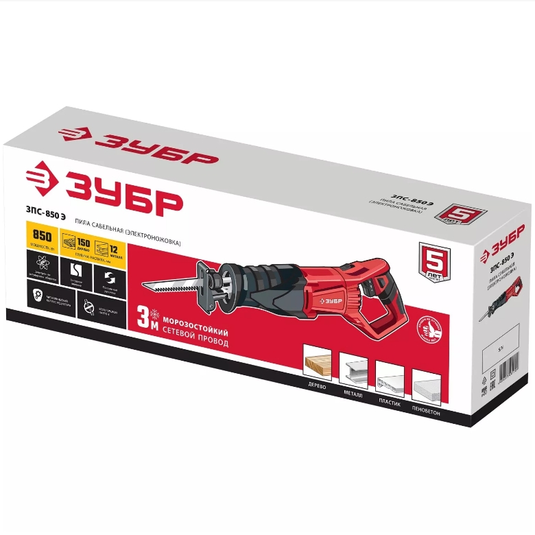 Пила сабельная (электроножовка) ЗУБР ЗПС-850 Э применяется для продольного, поперечного, косого и фигурного пиления заготовок из дерева, фанеры, ДСП, пластмасс, металла, пенобетона, газобетона, гипсолита, кирпича (при установке соответствующего полотна), а также широко применяется для демонтажных и монтажных работ.