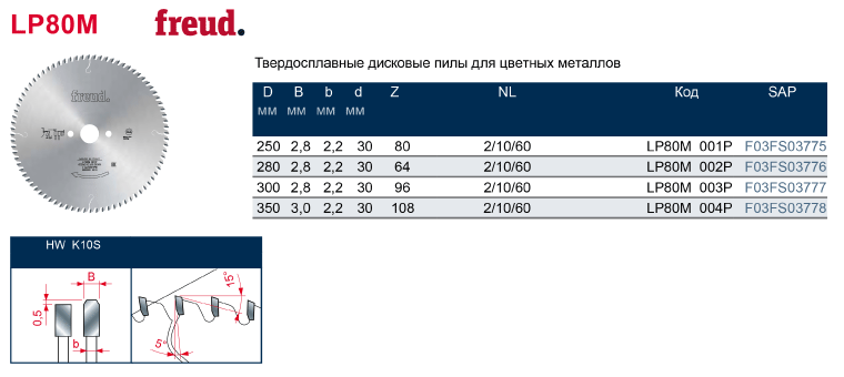 Твердосплавная дисковая пила LP80M 004 – применяется для распила цветных металлов и пиления профильных заготовок, труб толщиной от 2 до 5 мм, а также для полимерных панелей толщиной до 20мм. Пильный диск имеет прямой, трапециевидный зуб с положительным передним углом.