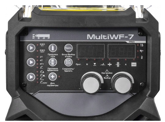 Подающий механизм КЕДР MultiWF-7 MultiMIG-5000DP используется для протяжки проволоки во время сварки. Используется совместно с полуавтоматом. Подающий механизм имеет связь со сварочным источником питания посредством многожильного управляющего и сварочного кабелей. На устройстве подачи проволоки дублируются все органы управления сварочного источника, что позволяет осуществлять настройку всех параметров непосредственно с подающего устройства.