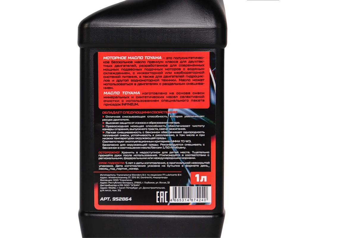Моторное масло Toyama 952864 – это полусинтетическое беззольное масло премиум класса для двухтактных двигателей, разработанное для современных мощных лодочных моторов с водяным охлаждением, а также для двигателей гидроциклов и другой водномоторной техники.
