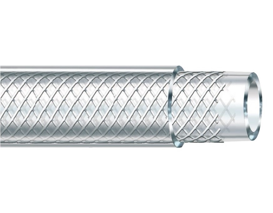 - Стеклянно-прозрачный трёхслойный шланг ПВХ, армированный полиэстерной нитью.