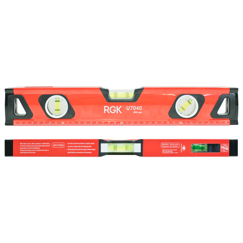 - На узком верхнем ребре строительного уровня RGK U7040 находится окошко, в котором с помощью системы зеркал отображается положение пузырька вертикального уровня. Благодаря этому, удобно контролировать вертикальные поверхности в узких нишах и в прочих труднодоступных местах.