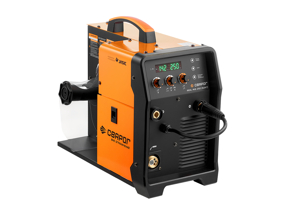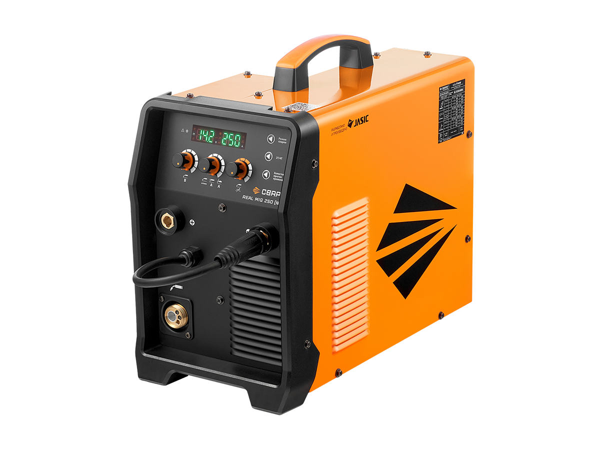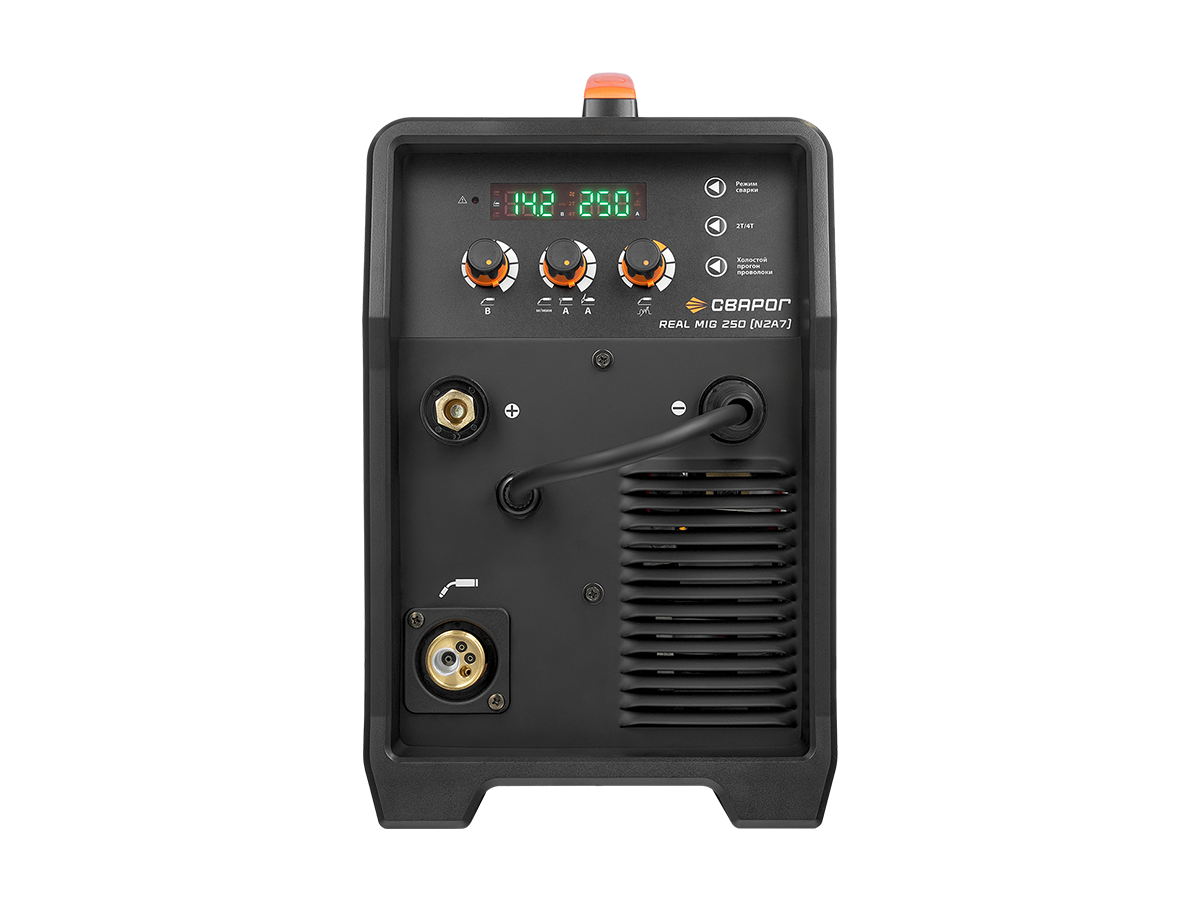 - REAL MIG 250 (N2A7) — это мощный полуавтомат, работающий от сети 220 В, что делает его оптимальным решением для мастерских и производств без доступа к промышленной сети 380 В.