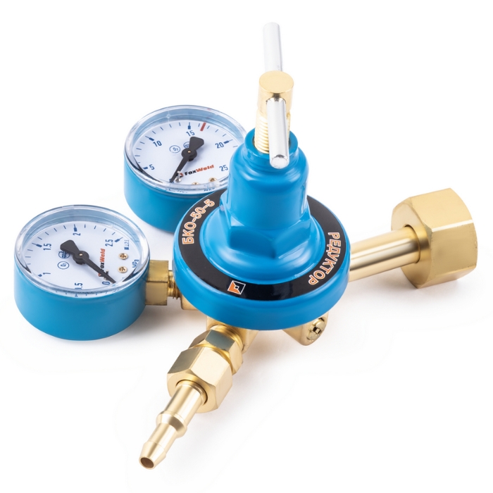 Редуктор Foxweld БКО-50-5 используется для регулировки подачи кислорода на выходе из баллона, снижает и выравнивает давление газа до рабочего уровня, поддерживает его заданный расход при газопламенной обработке.