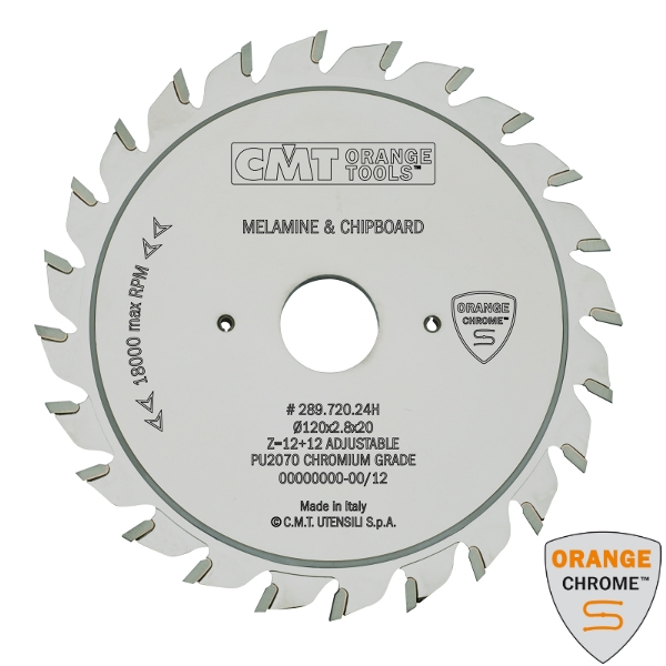 Подрезная регулируемая (составная) пила СМТ 289.725.24H – применяется для раскроя ламинированных панелей, ДСП, ЛДСП, МДФ без сколов. Регулируемая пазовая пила позволяют менять ширину паза с помощью установки проставочных колец между дисками пилы. Этот диск рекомендуется использовать для панелей с перепадами по толщине, гнутых панелей. Выступ регулируемой подрезной пилы над пильным столом должен быть не больше 3 мм. При работе с большей глубиной пропила ресурс подрезной пилы значительно снижается. Пила работают в паре с основным пильным диском для выборки небольшого паза с обратной стороны ламинированной панели для предотвращения сколов. Подрезная пила должна выбирать паз на 0,1-0,2 мм шире, чем пропил основной пилы.