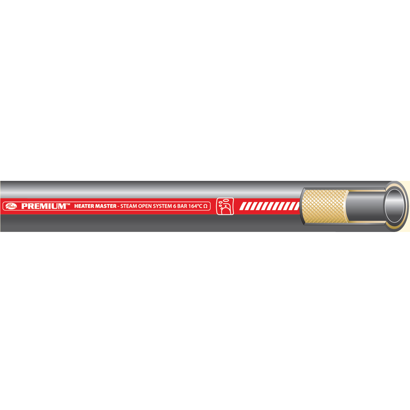 Шланг напорный PREMIUM™ HEATER MASTER - STEAM OPEN SYSTEM 6 BAR 164°C Ω диаметром 13 миллиметров - применяется перекачки горячей воды под давлением 20 Бар, до 90°C и пара под давлением до 6 Бар при температуре до 164С, в промышленном применении.