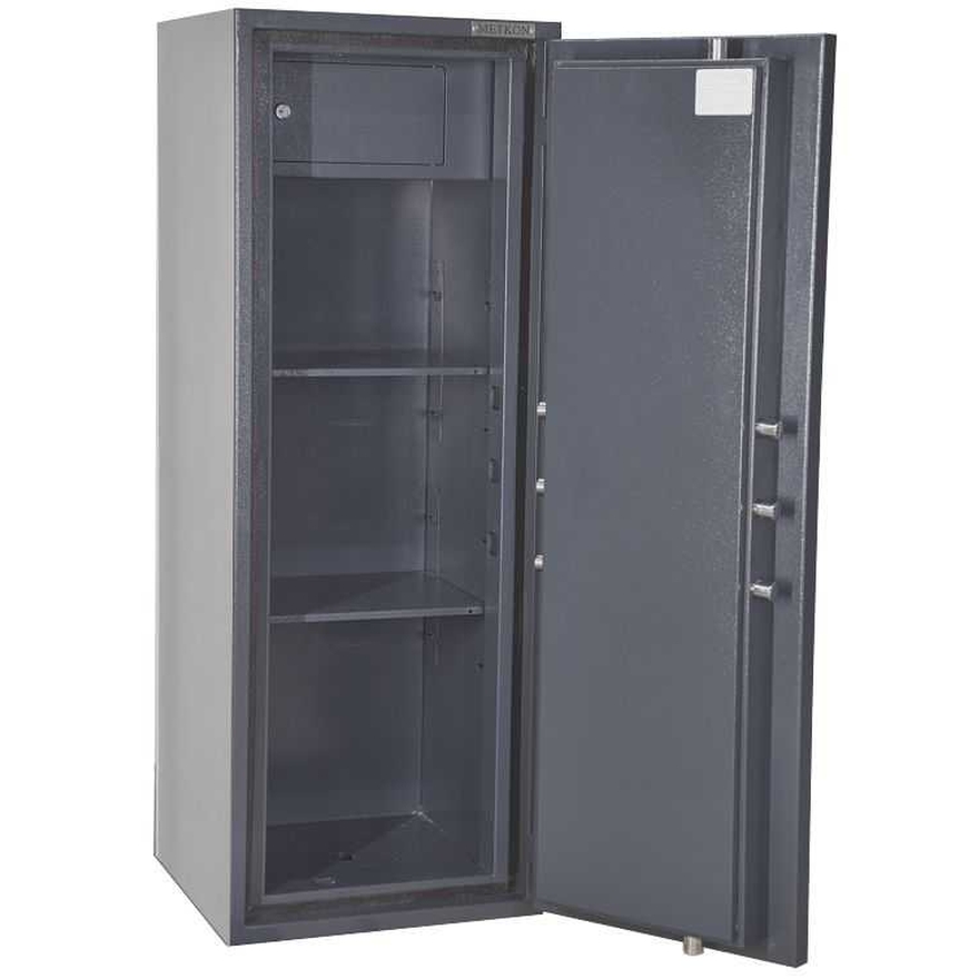 Сейф взломостойкий МетКон СМ-120Э предназначен для хранения бумажных документов. В двери установлен кодовый электронный замок SecuRam класса B. Для облегчения процесса открытия шкафа дверь оборудована поворотной ручкой.