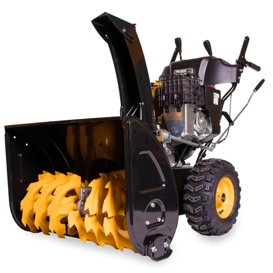 - Снегоуборочная машина оборудована топливным баком, вмещающим 5,6 л бензина. Малый расход горючего позволяет использовать агрегат продолжительное время. Для удобной эксплуатации в темное время суток предусмотрена галогенная фара. Особый протектор колес (диаметр 41 см) не позволяет пробуксовывать снегоуборщику даже при гололеде.