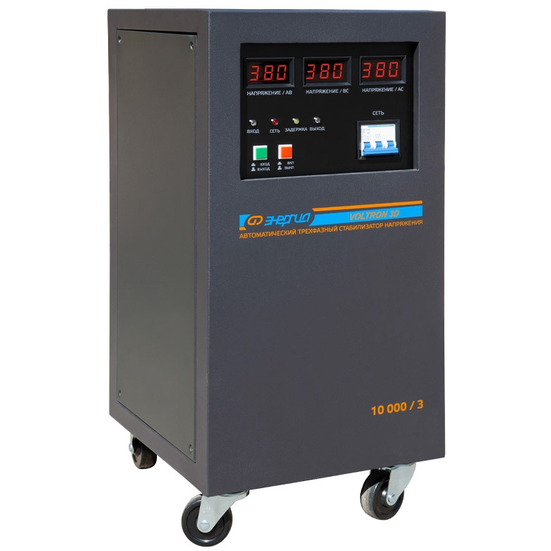 Стабилизатор напряжения Энергия Voltron 3D 10000/3 используется для поддержания величин фазных и линейных напряжений в трехфазной сети в пределах 3 % допуска в цепях электроснабжения потребителей промышленного и аналогичного назначения в сухих помещениях без источников пыли, химически активных веществ и взрывоопасных газов.