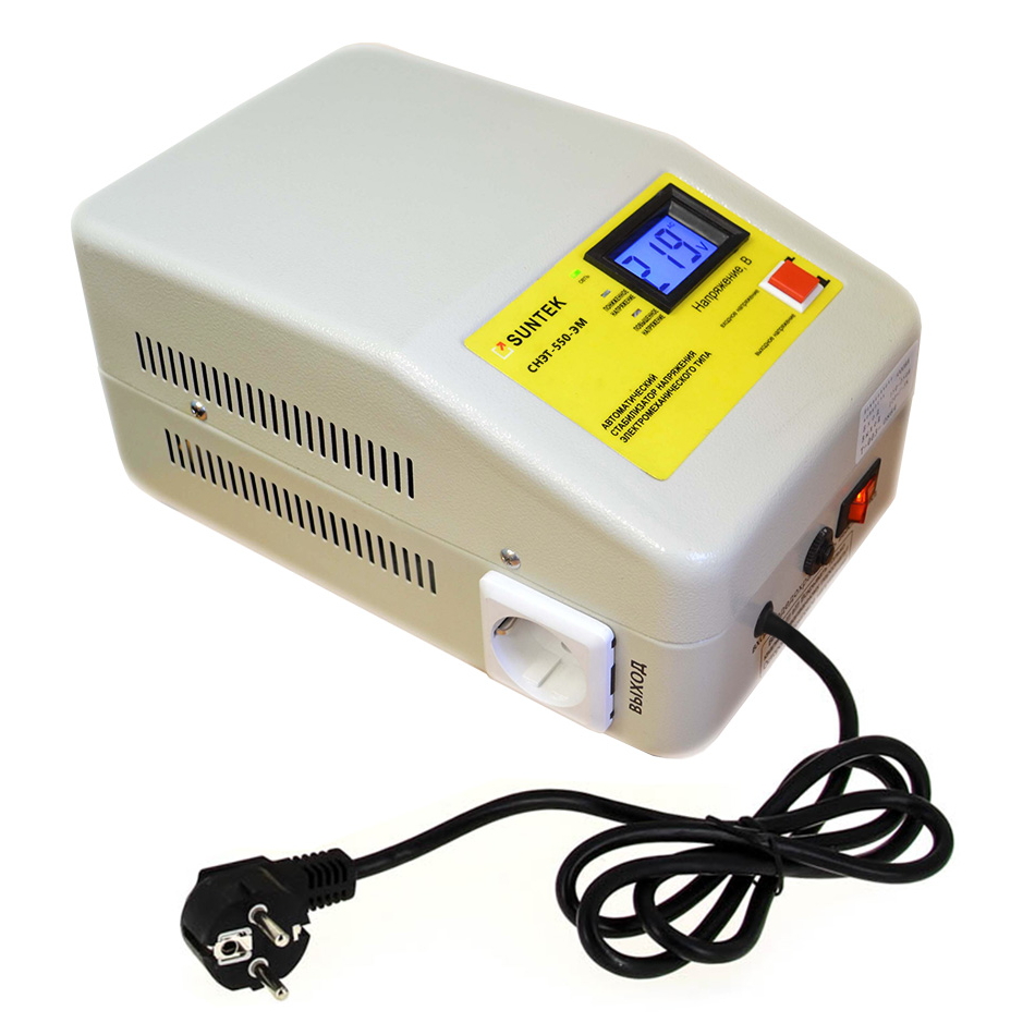 Стабилизатор напряжения SUNTEK ЭМ 550 ВА SE-550 120-285В используется для защиты современных моделей газовых котлов, компьютерной, аудио-видео техники и другого чувствительного оборудования от перепадов сетевого напряжения