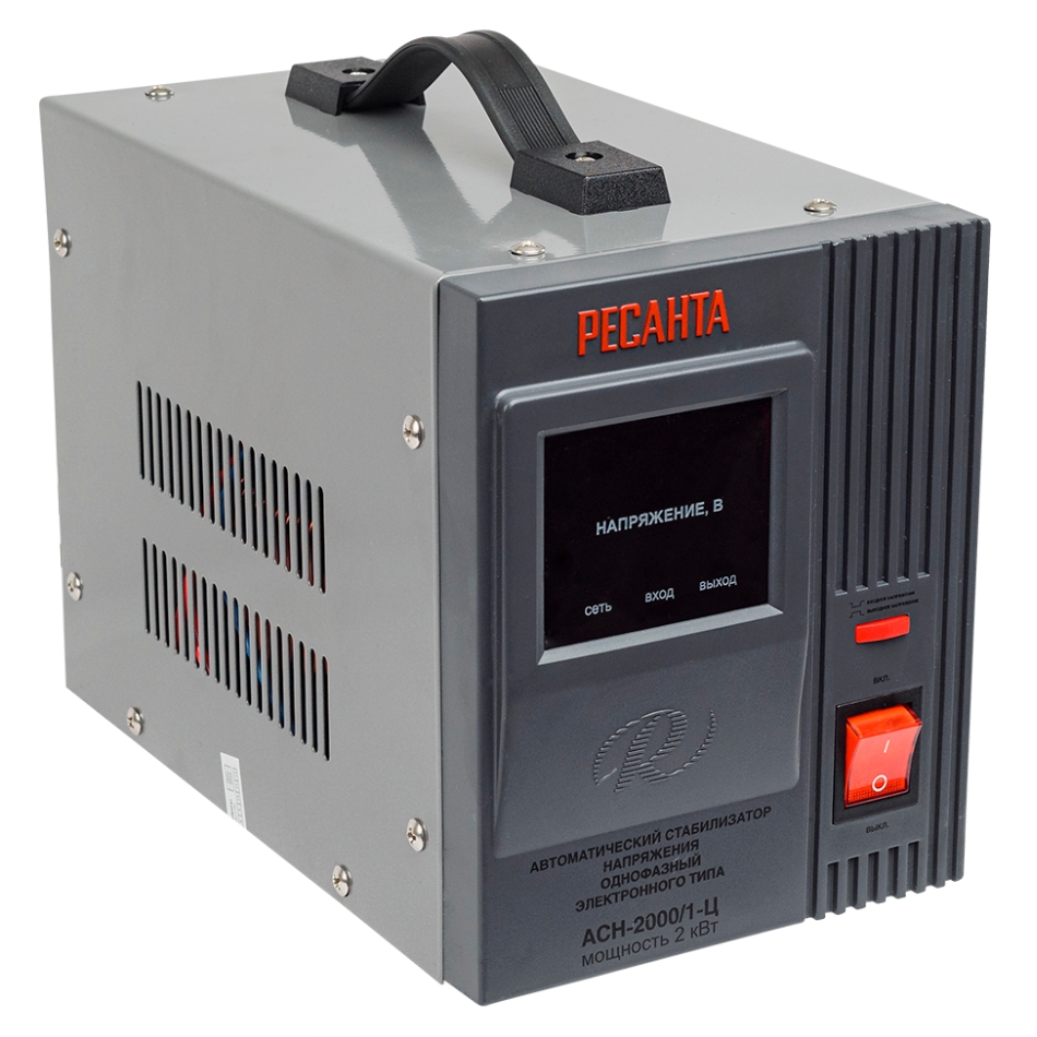 Стабилизатор Ресанта АСН-2000/1-Ц релейного типа предназначен для выравнивания входного напряжения и защиты приборов от перепадов напряжения. Устройство оснащено фильтрами сетевых помех, предотвращающими искажение частотной синусоиды, микропроцессорным управлением и цифровым индикатором напряжения, на котором отображаются параметры напряжения.
