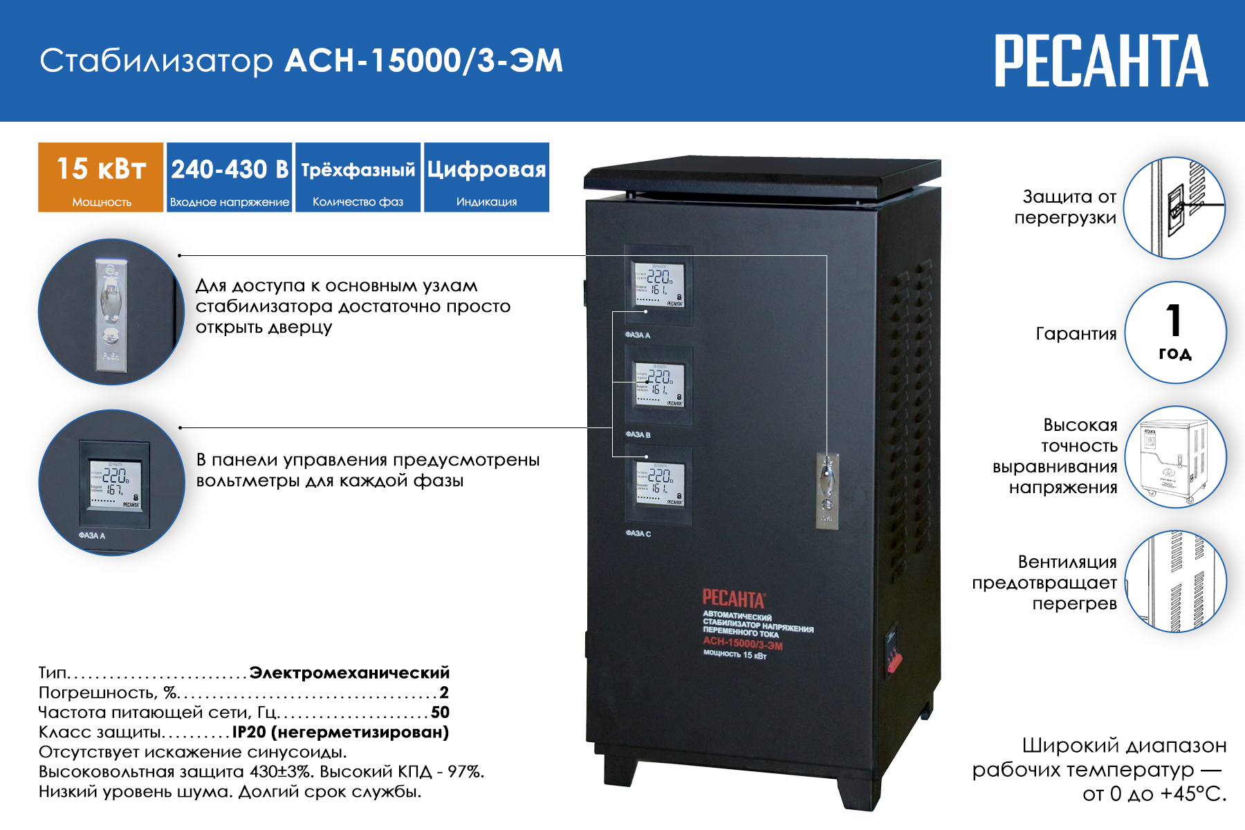 Технические характеристики стабилизатора ресанта трехфазный асн- 15 000/3