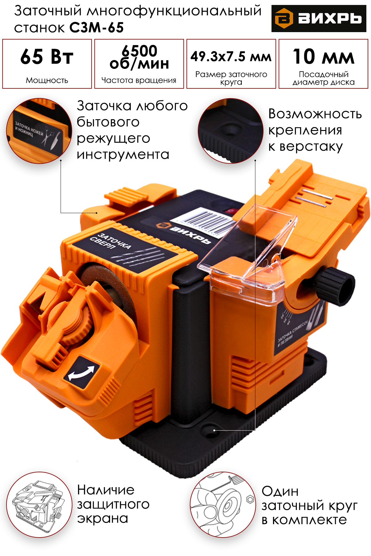 Станок заточной многофункциональный СЗМ-65 предназначен для заточки различного инструмента: сверл, стамесок, лезвий, ножниц и ножей. Прибор является универсальным, может затачивать разные типы лезвий благодаря точильному кругу диаметром 49,3 мм, который приводит в движение электромотор мощностью 65 Вт.