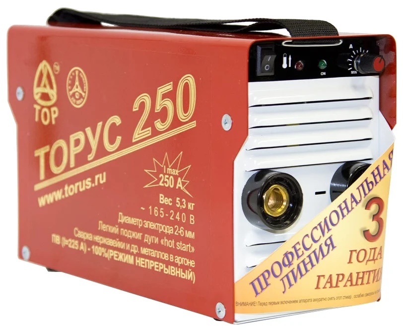 Сварочный инвертор ТОРУС-250 - используется для электродуговой сварки низкоуглеродистых, легированных и нержавеющих сталей, может работать в режимах TIG, MMA. Его легко переносить благодаря небольшому весу и наплечному ремню, поставляющемуся в комплекте. Предусмотрена защита от перегрева. Устройство имеет высокий коэффициент преобразования и значительно экономит электроэнергию. Инвертор сохраняет стабильность сварочной дуги даже при сильных колебаниях входного напряжения. ТОРУС-250 сохранил все основные выигрышные характеристики, присущие аппаратам рабочей линии: сварка MMA/TIG, малый вес, высокий ПВ, возможность работать от слабой электросети со значительными просадками, простота работы и высокая надежность.