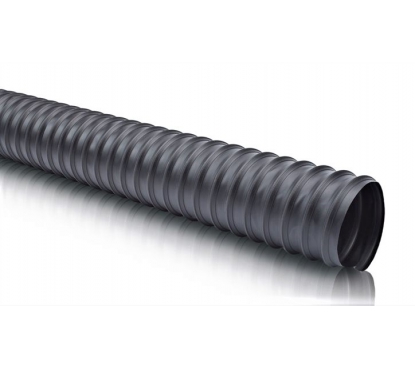 Черный термопластичный шланг-воздуховод E-150-H диаметром 152 миллиметра, толщиной стенки 0,6 мм, на основе полиэфирной (лавсановой) ткани, которая покрытая термопластичным материалом на базе EPDM каучука, армированный стальной спиралью. Рукав устойчив к высоким температурам, агрессивным средам, истиранию, озону, воздействию горячей холодной воды, воздействию пара, высокоустойчив к пиву и продуктам брожения, сохраняет эластичность при низких температурах. Воздуховод применятся для удаления Удаление выхлопных газов, всасывание гранулированных средней абразивности продуктов, транспортировка горячего воздуха и жидкостей, в т.ч. кислотно-щелочных сред, подача нагретого воздуха при использовании переносных обогревателей, канализация. Устойчив к старению, погодным условиям, имеет отличные диэлектрические свойства.