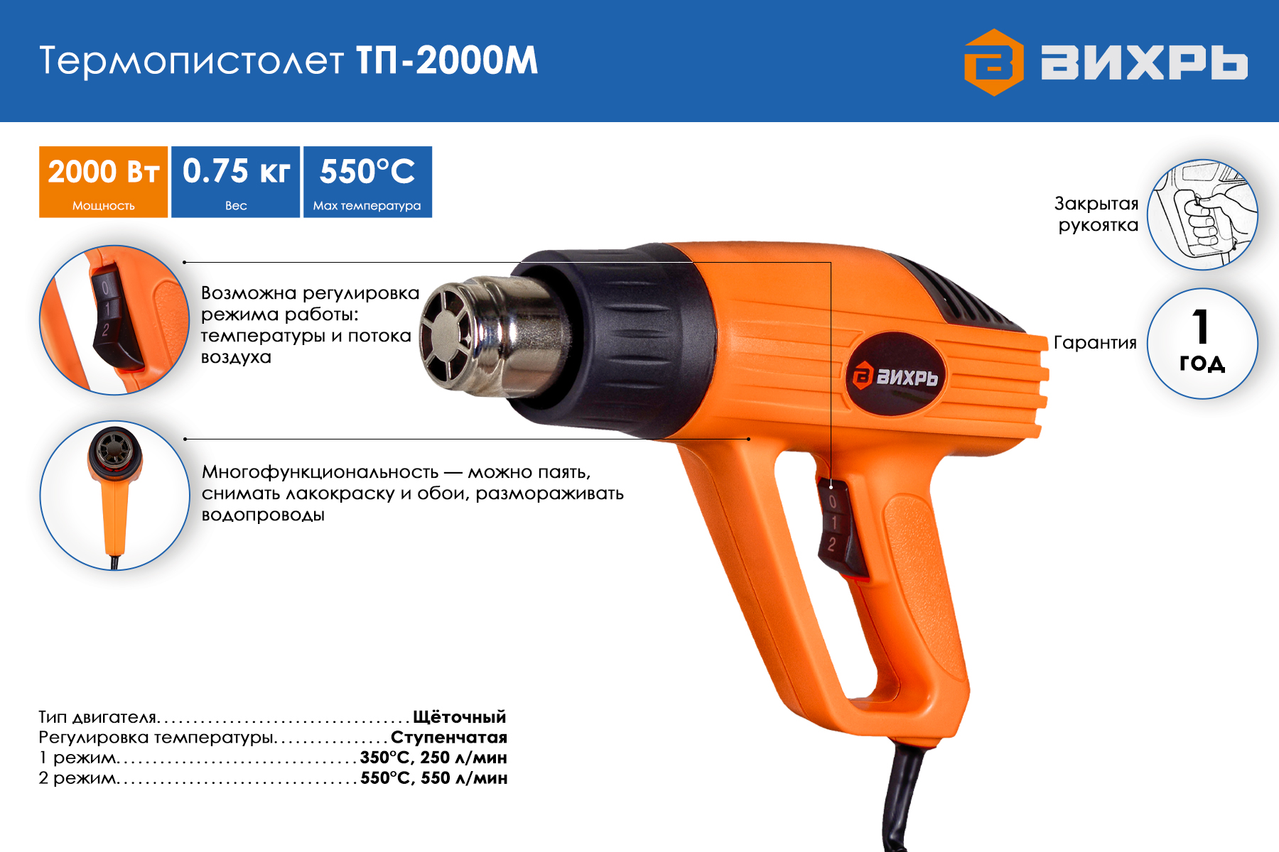Термопистолет Вихрь ТП-2000М 72/2/2 испольхуется для удаления лакокрасочных покрытий, пайки и фиксации с использованием различных материалов. Небольшой вес инструмента снижает энергоемкость рабочего процесса.