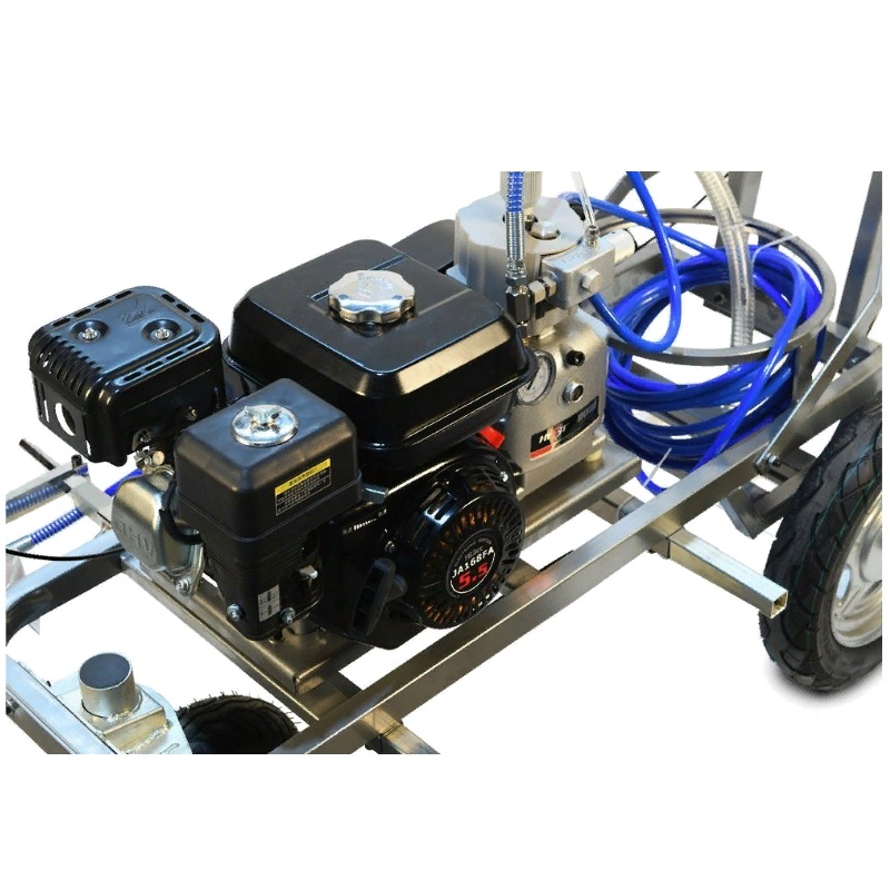Установка для нанесения дорожной разметки HYVST SPLM-850 - используется для безвоздушного нанесения дорожной разметки краской на асфальт. Разметочная машина собрана на базе поршневого насоса для краски и бензинового силового агрегата. Машину можно толкать, а также использовать в качестве подающего поршневого насоса с бензиновым силовым агрегатом и держать машину в кузове грузовика. Краска может наноситься пистолетом ручным способом по шаблону. Оснащена двумя пистолета для нанесения сплошных или прерывистых линий. Приводится в движение ручным способом благодаря колесам. Возможна фиксация переднего колеса для поворота при работе на необходимый радиус. Давление подачи краски визуализируется на встроенном манометре.