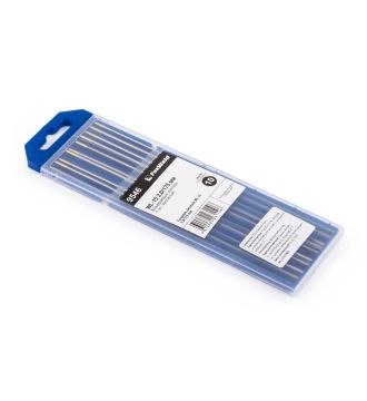 Вольфрамовый электрод марки WL-15 золотистого цвета предназначен для аргонодуговой сварки (TIG) на переменном (AC) и постоянном (DC) токе. Электрод легирован оксидом лантана (La₂O₃) для улучшения качественных свойств и повышения стойкости. Электроды WL-20 подходят для сварки алюминия, углеродистых и нержавеющих сталей на максимальных токах. Вольфрамовые электроды этой марки характеризуются хорошим поджигом и обеспечивают стабильное горение дуги как при высоких, так и при низких значениях сварочного тока.