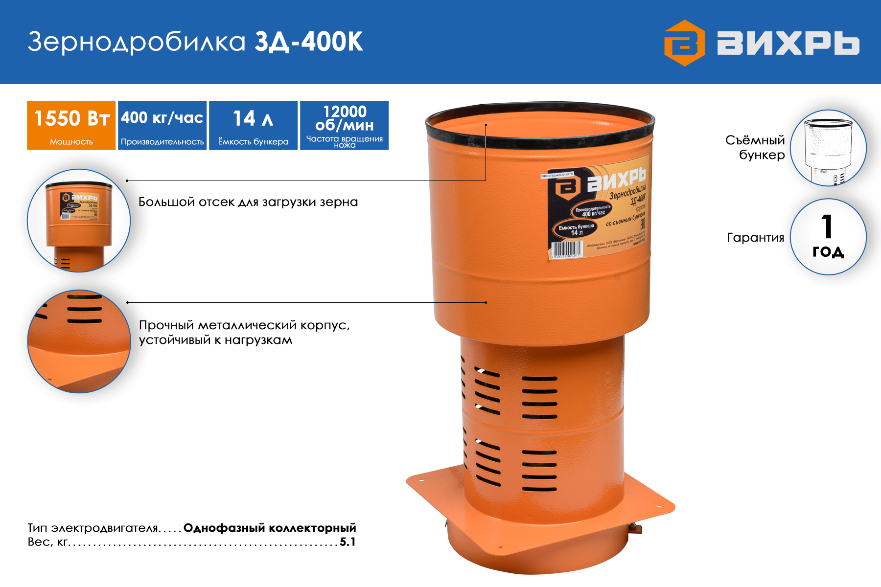Технические характеристики зернодробилки ЗД-400К Вихрь